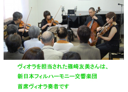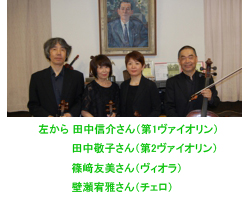 スズキ・メソード出身の田中信介さん(第1ヴァイオリン)、田中敬子さん(第2ヴァイオリン)、篠﨑友美さん(ヴィオラ)、壁瀬宥雅さん(チェロ)で編成されたラミー弦楽四重奏団の演奏会が、3連休の中日にあたる2015年10月11日(日)、松本市の鈴木鎮一記念館で開催されました。ラミー弦楽四重奏団は才能教育研究会 京都支部の弦楽合奏団、コンチェルティーノ・ディ・キョートのメンバーで結成され、一昨年40周年を迎えました。
