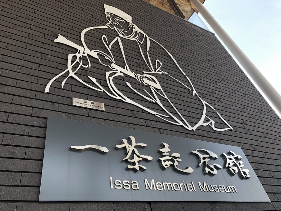 まず、建物正面の壁に一茶記念館の看板と大きな一茶が目に飛び込んできます。